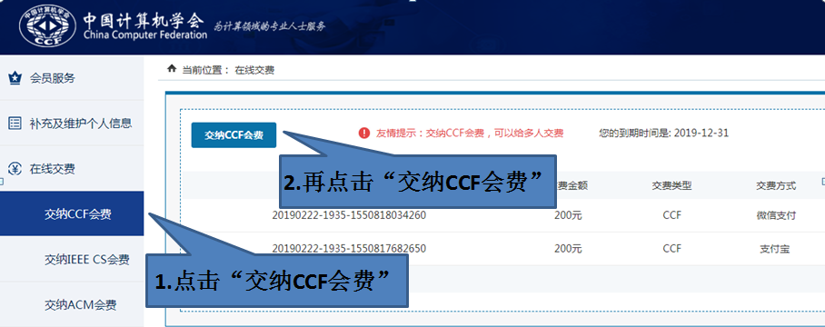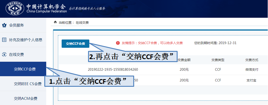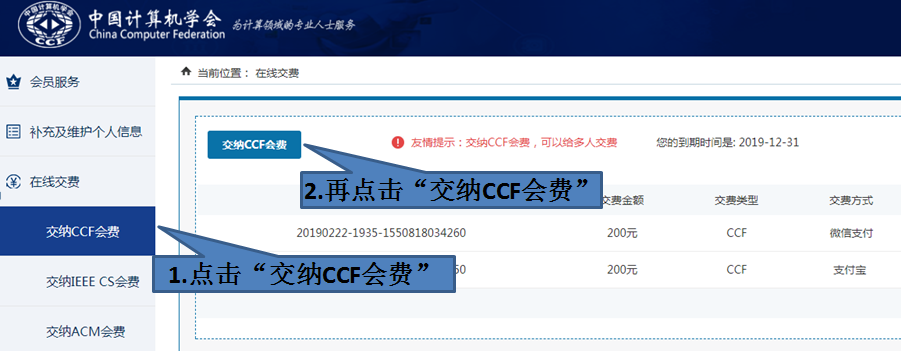 选择“在线缴费”,点击“缴纳CCF会费”,如下图所示: