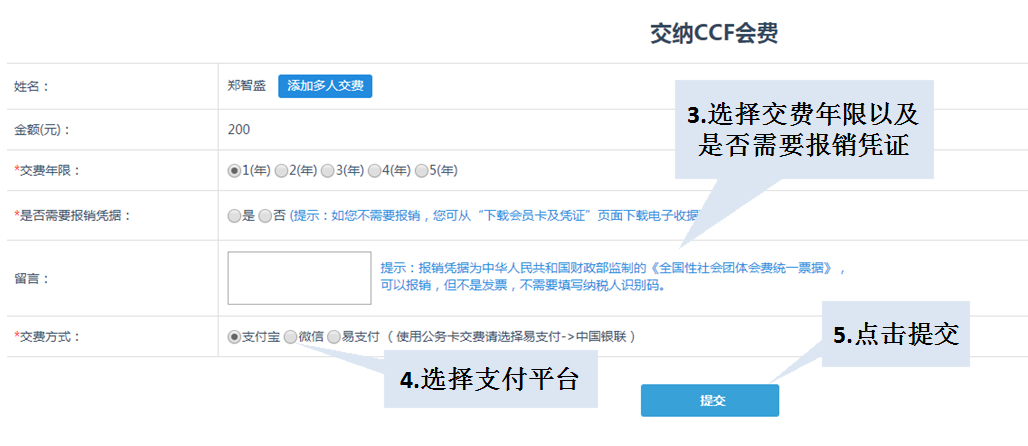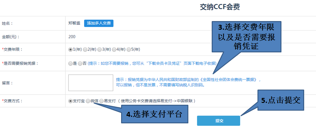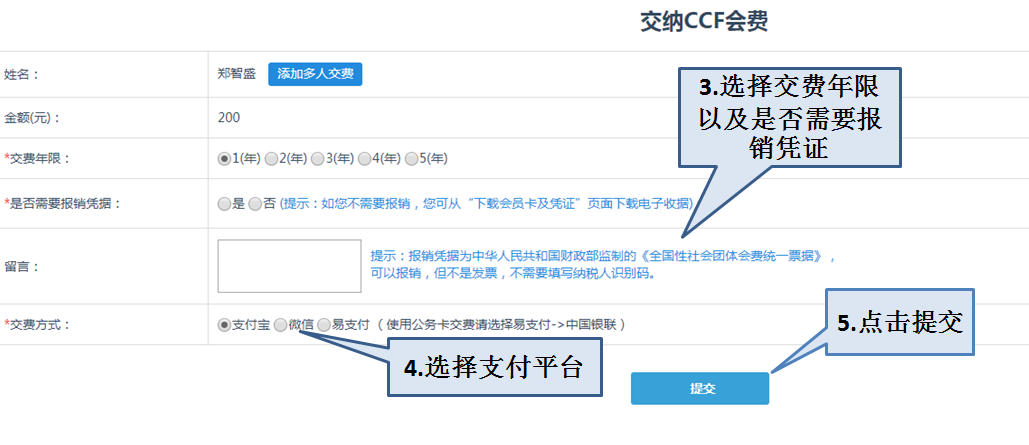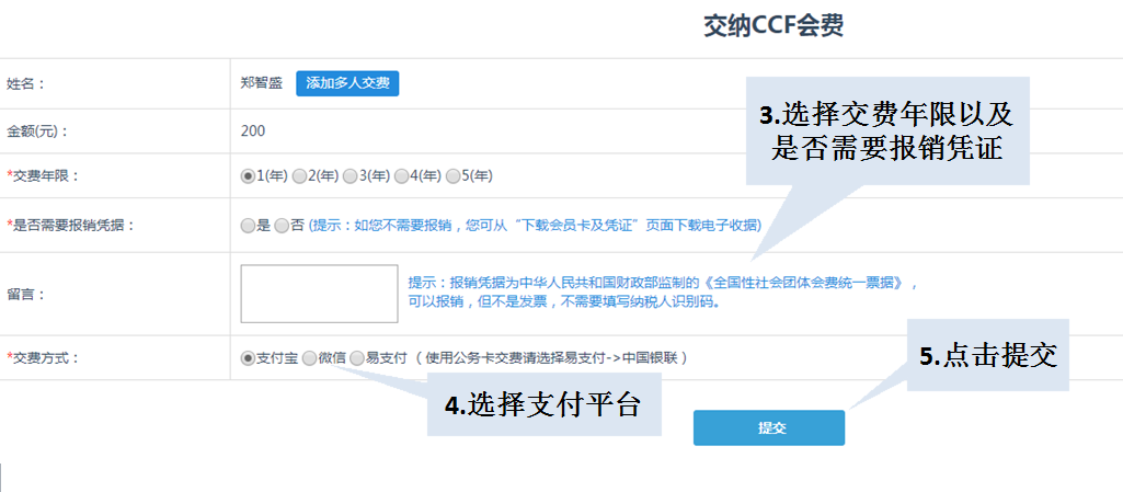 请认真填写您的缴费信息,选择缴费年限,从微信、支付宝、易支付三种支付平台中选择一种,如下图所示: