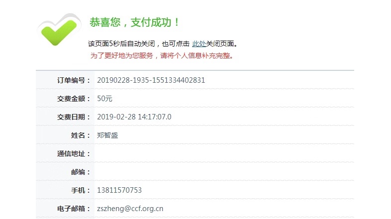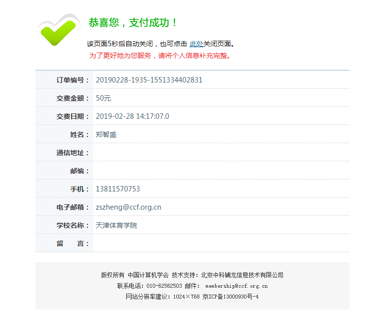 根据“微信”、“支付宝”、“易支付”的提示进行操作,支付完成后,会员系统出现“恭喜您,支付成功页面”,该页面显示5秒后自动关闭,如下图所示: