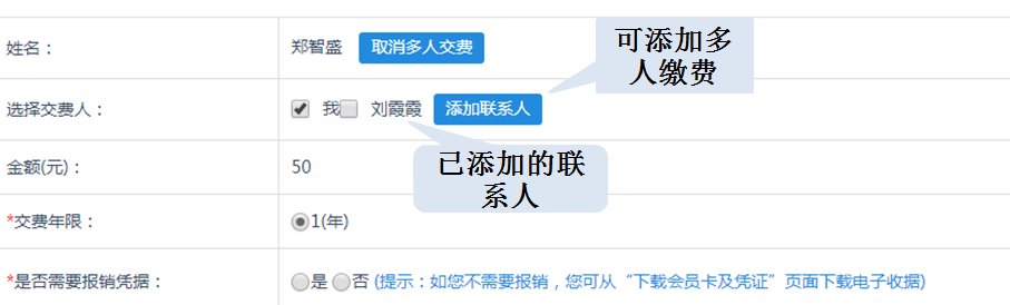 4. 您可添加多人缴费,每次只能缴纳每位会员一年的有效资格,如下图所示: